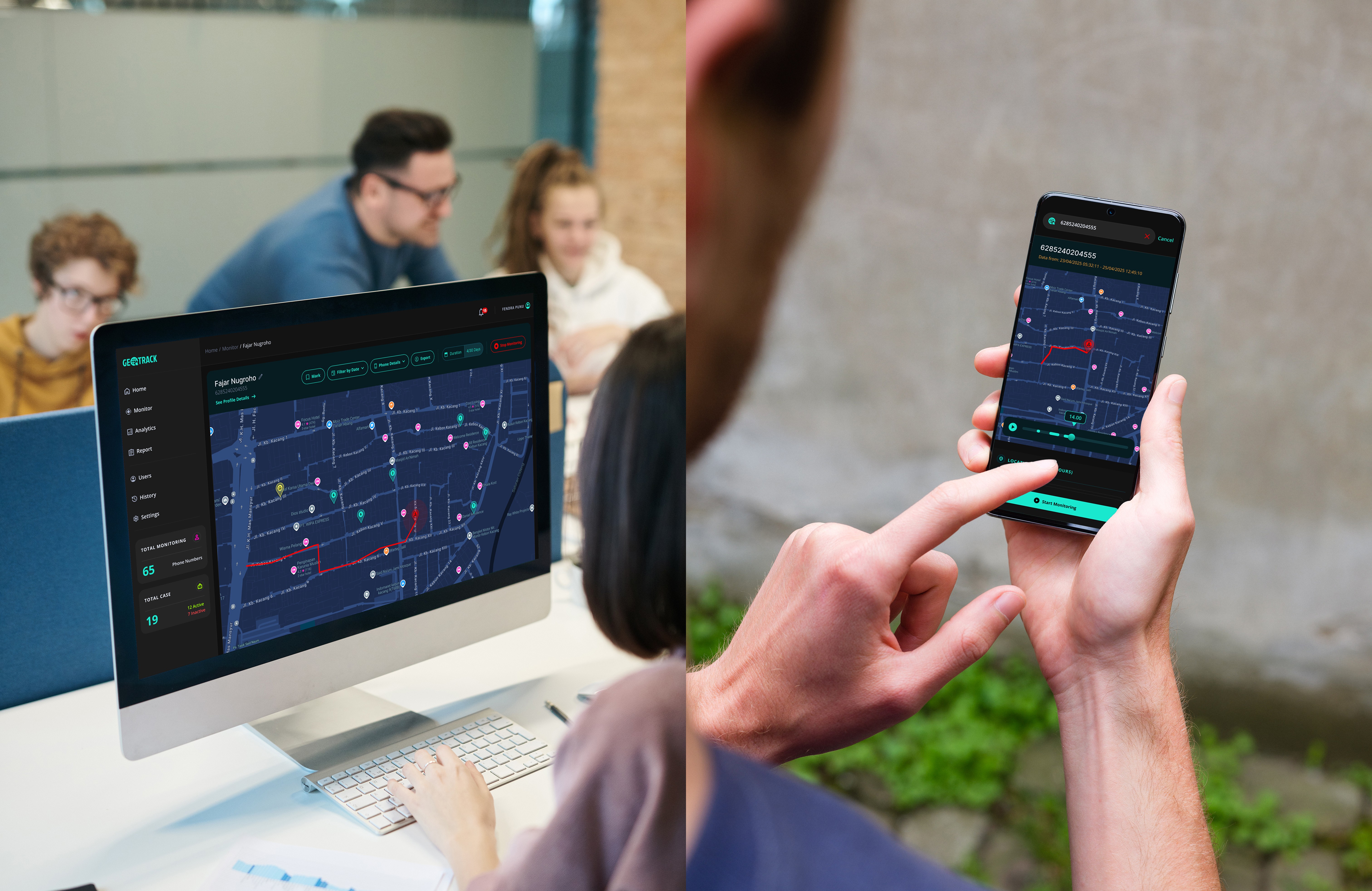 Develop a web and mobile platform that centralizes geolocation data, enabling users to visualize movement histories, identify key locations, and detect group interactions among multiple targets.