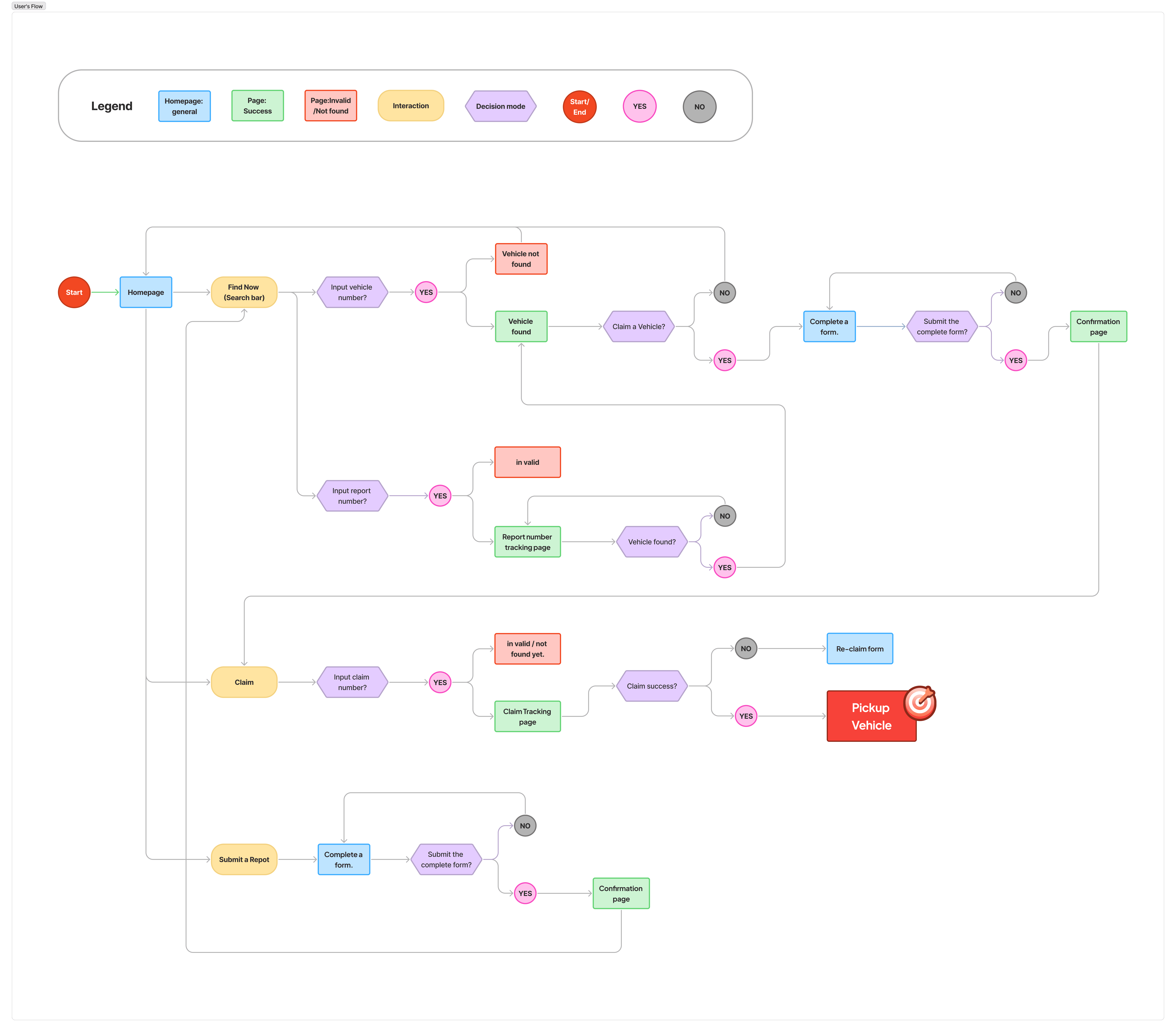 I designed a user flow that maps the end-to-end journey based on user needs, covering key actions such as searching for, reporting, and claiming a stolen vehicle.