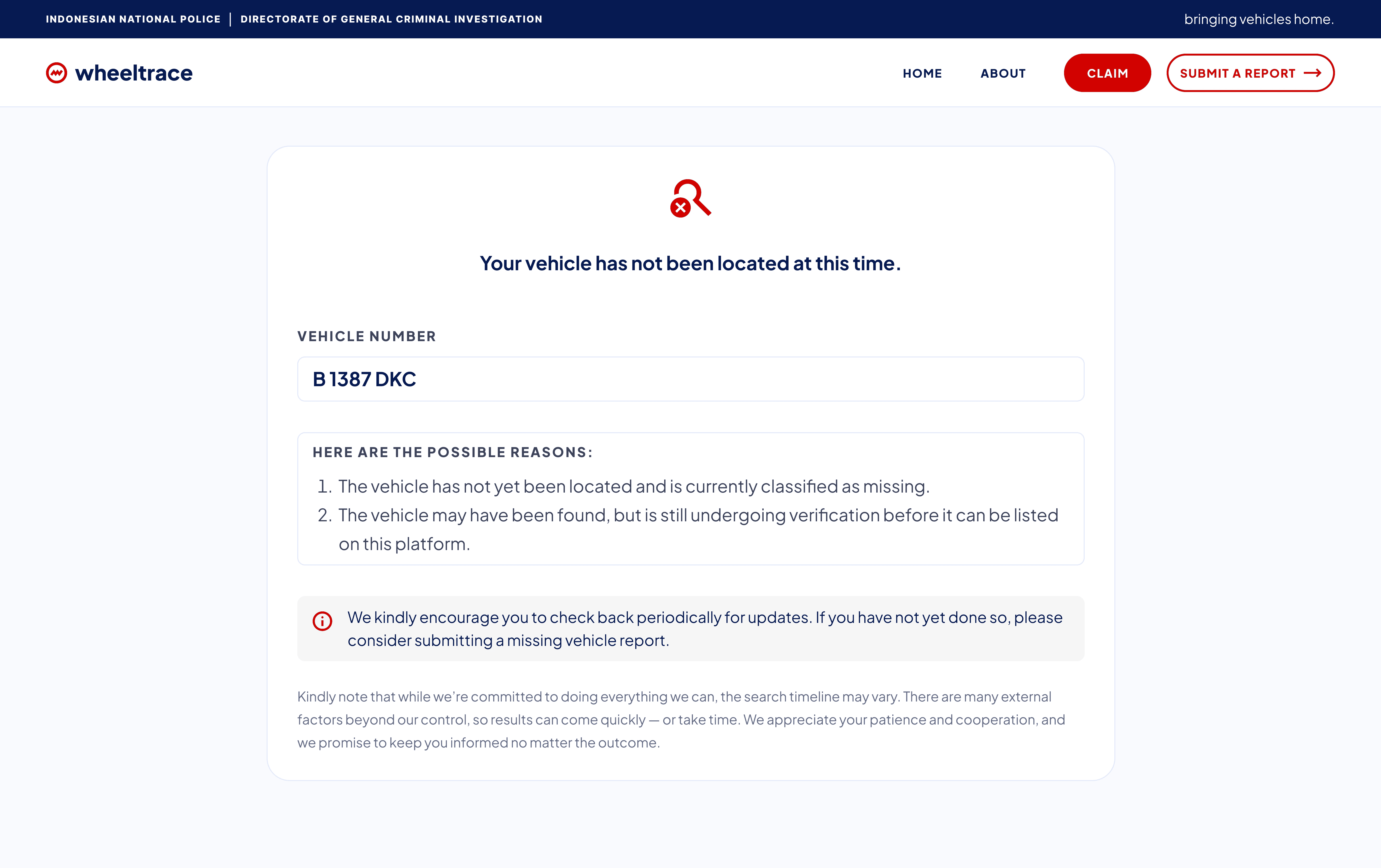 Wheeletrace platform is a centralized web-based system that allows vehicle owners to search for their vehicles, verify recovery status, and initiate claims efficiently. This platform improves transparency, streamlines coordination between victims and law enforcement, and increases the chances of successful vehicle recovery.