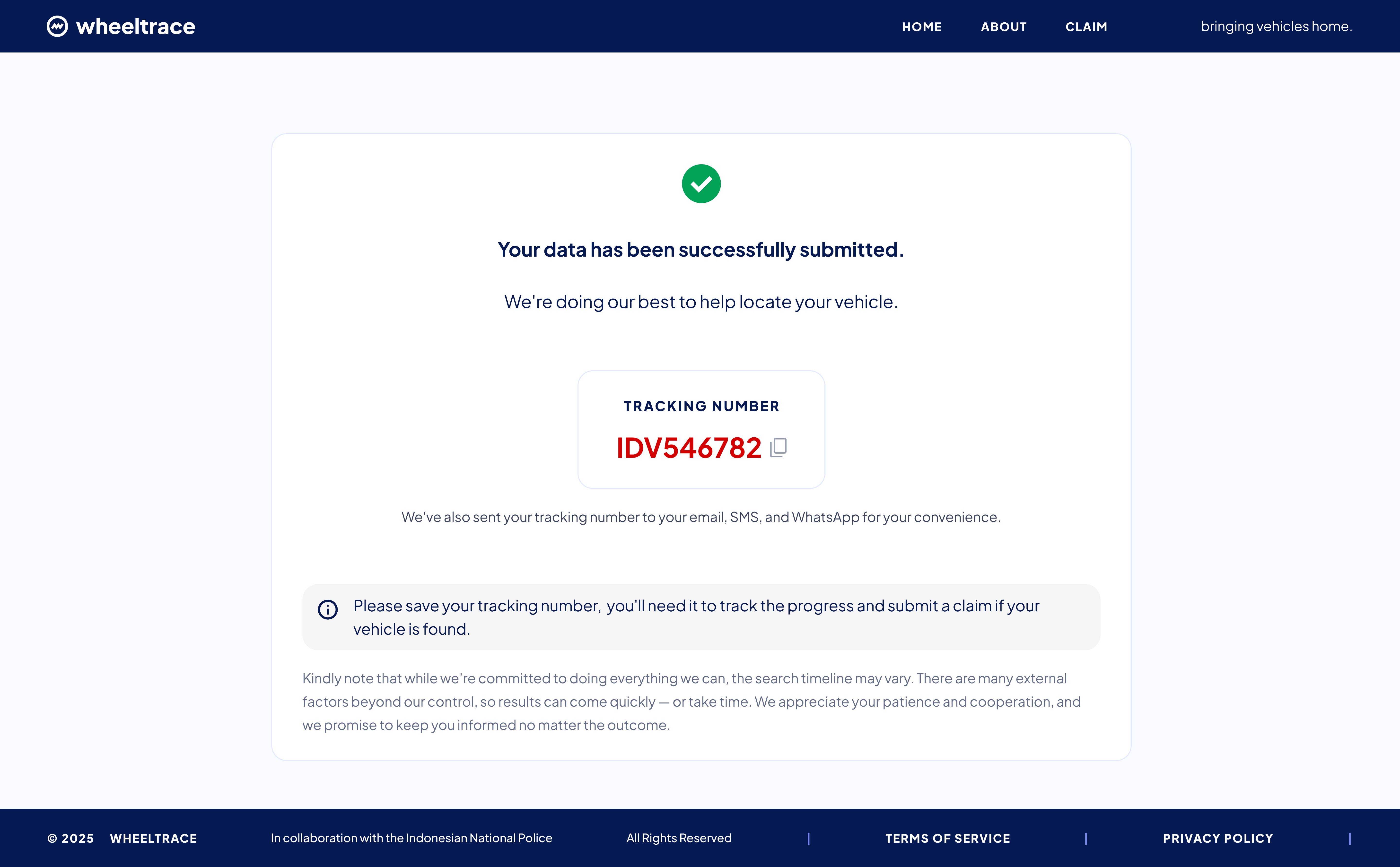 With the Tracking Report and Claim Tracking features, users can monitor the status of their reported or claimed vehiclesโwhether the vehicle has been found or if the claim has been verified and is ready for pickup.